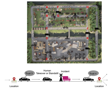 The image shows a route planning scenario for AVs. On top is a map with three types of road incidents (pedestrian, obstacle, and oncoming truck). The bottom part depicts a schematic view of the decision-making process.