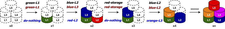 The image shows an optimal strategy generated for a human-robot co-assembly problem, where the robot with a “trembling hand” aims to assemble an arch from blocks along with a human in a shared workspace. During assembly, the robot can perform actions to relocate blocks, and the human may perform moves to intervene. Robot-intended actions, robot-executed actions, and human interventions are shown in black, brick, and blue, respectively.
