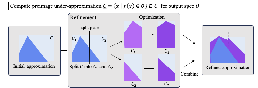 The image illustrates the workflow for preimage under-approximation (shown in 2D for clarity). Given a neural network and output specification O, our algorithm generates an under-approximation to the preimage. Starting from the input region C, the procedure repeatedly splits the selected region into smaller subregions C1 and C2 with tighter input bounds, and then optimises the bounding and Lagrangian parameters to increase the volume and thus improve the quality of the under-approximation. The refined under-approximation is combined into a union of polytopes.