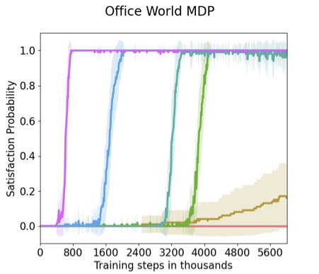 The image shows the performance of our algorithm (pink) on Office World environment compared to state of the art.